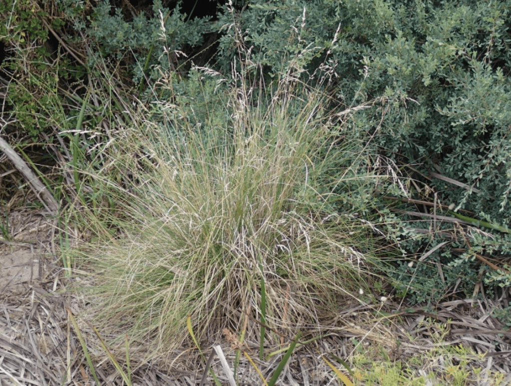 Poa Labillardieri is a tussock grass native to Australia and is common on moist soils throughout southern and eastern Australia including Tasmania. It favours open forest areas, grassy woodland and moister areas on low slopes and valley floors that are frequently wet. The dull green leaf blades have a rough feel, grow up to 80 cm long and are channelled or sometimes flat. The culms (seed heads) are up to 1.2 metres tall and the inflorescence or flowering heads occur in an open pyramid shape up to 25 cm long, from October to February.